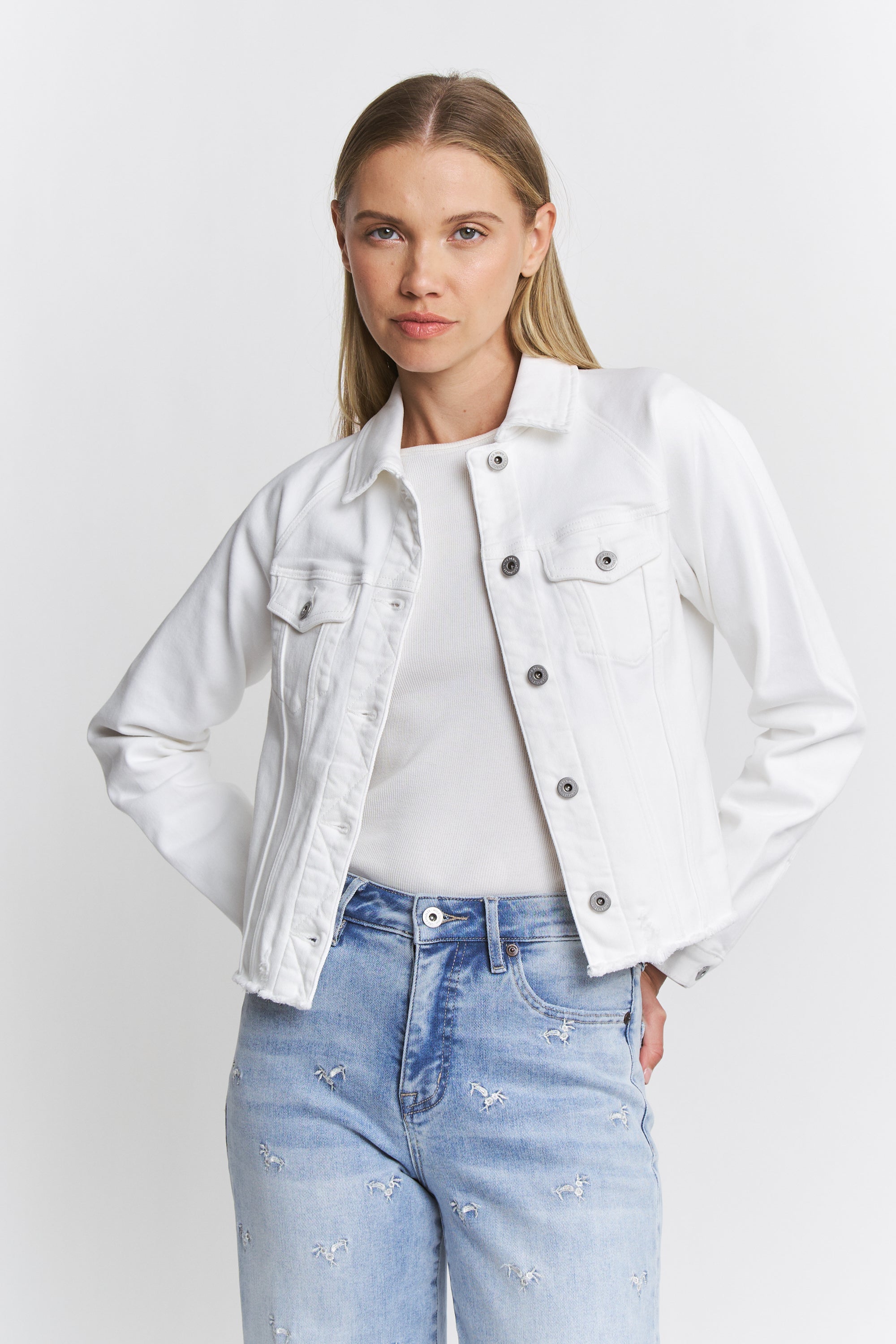RAW HEM DENIM JACKET / LEATHER PATCH
